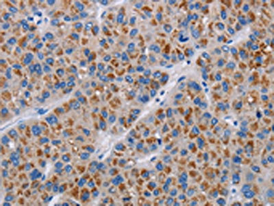 The image on the left is immunohistochemistry of paraffin-embedded Human liver cancer tissue using CSB-PA203427(COX18 Antibody) at dilution 1/20, on the right is treated with synthetic peptide. (Original magnification: ×200)