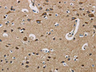 The image is immunohistochemistry of paraffin-embedded Human brain tissue using CSB-PA877027(COX6B1 Antibody) at dilution 1/50. (Original magnification: ×200)