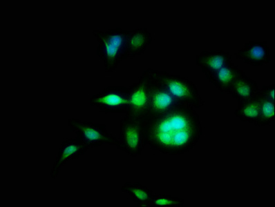 Immunofluorescence staining of Hela cells with CSB-PA818773LA01HU at 1:100, counter-stained with DAPI. The cells were fixed in 4% formaldehyde, permeabilized using 0.2% Triton X-100 and blocked in 10% normal Goat Serum. The cells were then incubated with the antibody overnight at 4°C. The secondary antibody was Alexa Fluor 488-congugated AffiniPure Goat Anti-Rabbit IgG(H+L).