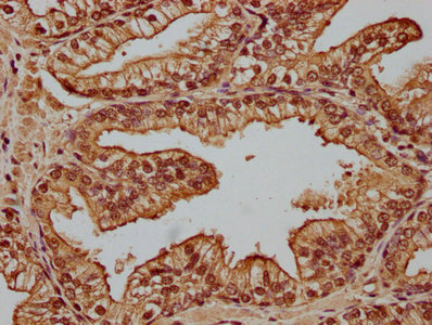 IHC image of CSB-PA859524LA01HU diluted at 1:100 and staining in paraffin-embedded human prostate cancer performed on a Leica BondTM system. After dewaxing and hydration, antigen retrieval was mediated by high pressure in a citrate buffer (pH 6.0). Section was blocked with 10% normal goat serum 30min at RT. Then primary antibody (1% BSA) was incubated at 4°C overnight. The primary is detected by a biotinylated secondary antibody and visualized using an HRP conjugated SP system.