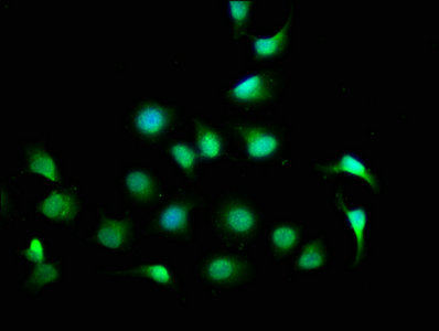 Immunofluorescence staining of A549 cells with CSB-PA866203LA01HU at 1:100, counter-stained with DAPI. The cells were fixed in 4% formaldehyde, permeabilized using 0.2% Triton X-100 and blocked in 10% normal Goat Serum. The cells were then incubated with the antibody overnight at 4°C. The secondary antibody was Alexa Fluor 488-congugated AffiniPure Goat Anti-Rabbit IgG(H+L).