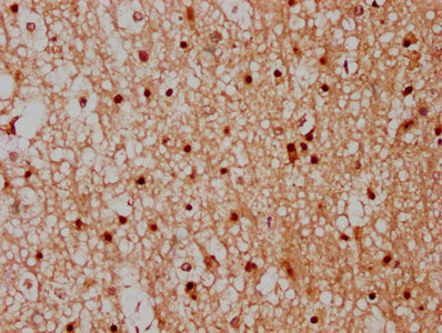 IHC image of CSB-PA866203LA01HU diluted at 1:300 and staining in paraffin-embedded human brain tissue performed on a Leica BondTM system. After dewaxing and hydration, antigen retrieval was mediated by high pressure in a citrate buffer (pH 6.0). Section was blocked with 10% normal goat serum 30min at RT. Then primary antibody (1% BSA) was incubated at 4°C overnight. The primary is detected by a biotinylated secondary antibody and visualized using an HRP conjugated SP system.