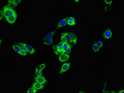 Immunofluorescent analysis of HepG2 cells using CSB-PA821674LA01HU at dilution of 1:100 and Alexa Fluor 488-congugated AffiniPure Goat Anti-Rabbit IgG(H+L)
