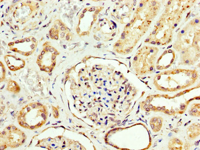 IHC image of CSB-PA005925LA01HU diluted at 1:200 and staining in paraffin-embedded human kidney tissue performed on a Leica BondTM system. After dewaxing and hydration, antigen retrieval was mediated by high pressure in a citrate buffer (pH 6.0). Section was blocked with 10% normal goat serum 30min at RT. Then primary antibody (1% BSA) was incubated at 4°C overnight. The primary is detected by a biotinylated secondary antibody and visualized using an HRP conjugated SP system.