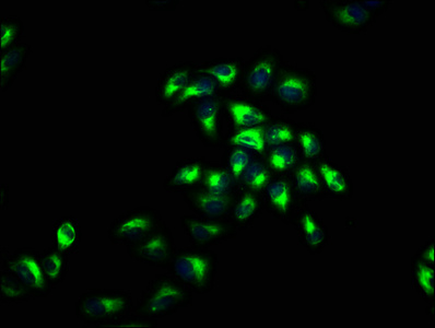 Immunofluorescence staining of Hela cells with CSB-PA005934LA01HU at 1:66, counter-stained with DAPI. The cells were fixed in 4% formaldehyde, permeabilized using 0.2% Triton X-100 and blocked in 10% normal Goat Serum. The cells were then incubated with the antibody overnight at 4°C. The secondary antibody was Alexa Fluor 488-congugated AffiniPure Goat Anti-Rabbit IgG(H+L).