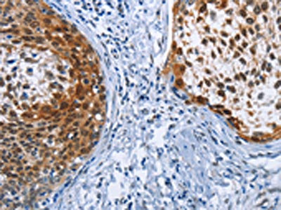 The image on the left is immunohistochemistry of paraffin-embedded Human cervical cancer tissue using CSB-PA121899(CRABP2 Antibody) at dilution 1/40, on the right is treated with fusion protein. (Original magnification: ×200)