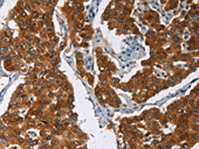 The image on the left is immunohistochemistry of paraffin-embedded Human breast cancer tissue using CSB-PA121899(CRABP2 Antibody) at dilution 1/40, on the right is treated with fusion protein. (Original magnification: ×200)