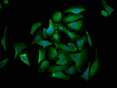 Immunofluorescence staining of A549 cells with CSB-PA005938HA01HU at 1:530, counter-stained with DAPI. The cells were fixed in 4% formaldehyde, permeabilized using 0.2% Triton X-100 and blocked in 10% normal Goat Serum. The cells were then incubated with the antibody overnight at 4°C. The secondary antibody was Alexa Fluor 488-congugated AffiniPure Goat Anti-Rabbit IgG(H+L).