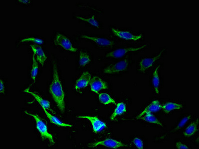 Immunofluorescent analysis of Hela cells using CSB-PA005965EA01HU at dilution of 1:100 and Alexa Fluor 488-congugated AffiniPure Goat Anti-Rabbit IgG(H+L)