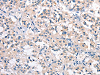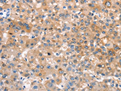 The image on the left is immunohistochemistry of paraffin-embedded Human liver cancer tissue using CSB-PA557863(CRHR2 Antibody) at dilution 1/25, on the right is treated with synthetic peptide. (Original magnification: ×200)