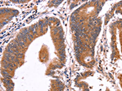 The image on the left is immunohistochemistry of paraffin-embedded Human colon cancer tissue using CSB-PA795553(CRISP3 Antibody) at dilution 1/50, on the right is treated with fusion protein. (Original magnification: ×200)