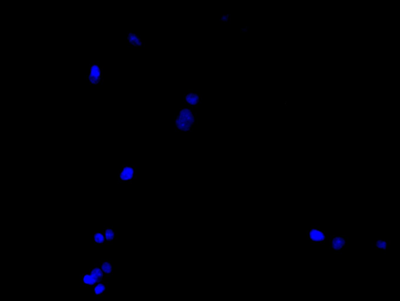 Immunofluorescence staining of U251 cell with 5% goat serum, counter-stained with DAPI. The cells were fixed in 4% formaldehyde and blocked in 10% normal Goat Serum. The cells were then incubated with the antibody overnight at 4C. The secondary antibody was Alexa Fluor 488-congugated AffiniPure Goat Anti-Rabbit IgG(H+L).
