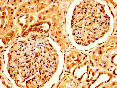 IHC image of CSB-PA006008HA01HU diluted at 1:200 and staining in paraffin-embedded human kidney tissue performed on a Leica BondTM system. After dewaxing and hydration, antigen retrieval was mediated by high pressure in a citrate buffer (pH 6.0). Section was blocked with 10% normal goat serum 30min at RT. Then primary antibody (1% BSA) was incubated at 4°C overnight. The primary is detected by a biotinylated secondary antibody and visualized using an HRP conjugated SP system.