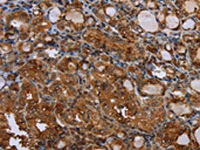 The image on the left is immunohistochemistry of paraffin-embedded Human thyroid cancer tissue using CSB-PA193987(CSF2RA Antibody) at dilution 1/35, on the right is treated with synthetic peptide. (Original magnification: ×200)