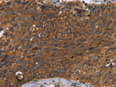 The image on the left is immunohistochemistry of paraffin-embedded Human cervical cancer tissue using CSB-PA193987(CSF2RA Antibody) at dilution 1/35, on the right is treated with synthetic peptide. (Original magnification: ×200)