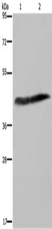 Gel: 8%SDS-PAGE, Lysate: 40 μg, Lane 1-2: Human placenta tissue, HepG2 cells, Primary antibody: CSB-PA193987(CSF2RA Antibody) at dilution 1/250, Secondary antibody: Goat anti rabbit IgG at 1/8000 dilution, Exposure time: 3 seconds