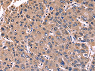 The image on the left is immunohistochemistry of paraffin-embedded Human liver cancer tissue using CSB-PA193371(CSNK1D Antibody) at dilution 1/50, on the right is treated with fusion protein. (Original magnification: ×200)