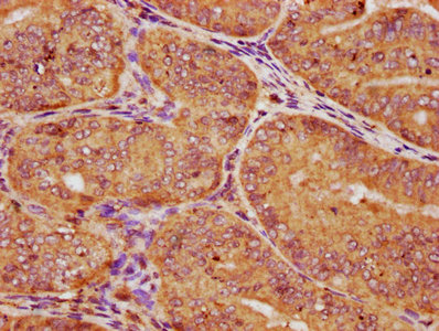 IHC image of CSB-PA01315A0Rb diluted at 1:150 and staining in paraffin-embedded human endometrial cancer performed on a Leica BondTM system. After dewaxing and hydration, antigen retrieval was mediated by high pressure in a citrate buffer (pH 6.0). Section was blocked with 10% normal goat serum 30min at RT. Then primary antibody (1% BSA) was incubated at 4°C overnight. The primary is detected by a biotinylated secondary antibody and visualized using an HRP conjugated SP system.