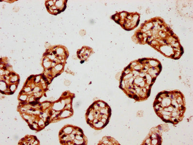 IHC image of CSB-PA01315A0Rb diluted at 1:150 and staining in paraffin-embedded human placenta tissue performed on a Leica BondTM system. After dewaxing and hydration, antigen retrieval was mediated by high pressure in a citrate buffer (pH 6.0). Section was blocked with 10% normal goat serum 30min at RT. Then primary antibody (1% BSA) was incubated at 4°C overnight. The primary is detected by a biotinylated secondary antibody and visualized using an HRP conjugated SP system.