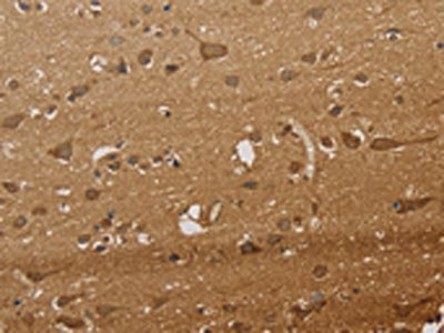 The image on the left is immunohistochemistry of paraffin-embedded Human brain tissue using CSB-PA099774(CSNK2B Antibody) at dilution 1/30, on the right is treated with synthetic peptide. (Original magnification: ×200)