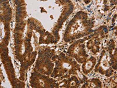 The image on the left is immunohistochemistry of paraffin-embedded Human colon cancer tissue using CSB-PA099774(CSNK2B Antibody) at dilution 1/30, on the right is treated with synthetic peptide. (Original magnification: ×200)