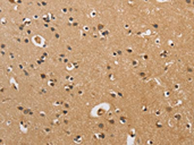 The image on the left is immunohistochemistry of paraffin-embedded Human brain tissue using CSB-PA954269(CST6 Antibody) at dilution 1/70, on the right is treated with fusion protein. (Original magnification: ×200)