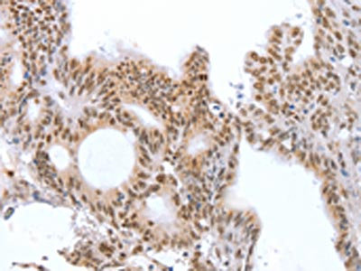 The image on the left is immunohistochemistry of paraffin-embedded Human breast cancer tissue using CSB-PA062537(CTBP2 Antibody) at dilution 1/25, on the right is treated with fusion protein. (Original magnification: ×200)