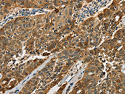 The image on the left is immunohistochemistry of paraffin-embedded Human liver cancer tissue using CSB-PA237699(CTSE Antibody) at dilution 1/50, on the right is treated with fusion protein. (Original magnification: ×200)