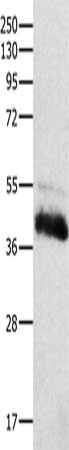 Gel: 10%SDS-PAGE, Lysate: 60 μg, Lane: Human liver cancer tissue, Primary antibody: CSB-PA560952(CTSH Antibody) at dilution 1/100, Secondary antibody: Goat anti rabbit IgG at 1/8000 dilution, Exposure time: 1 minute