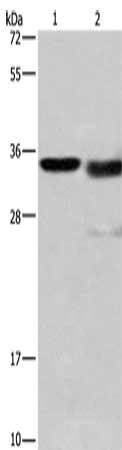 Gel: 15%SDS-PAGE, Lysate: 40 μg, Lane 1-2: Mouse kidney tissue, A172 cells, Primary antibody: CSB-PA092272(CTSL Antibody) at dilution 1/900, Secondary antibody: Goat anti rabbit IgG at 1/8000 dilution, Exposure time: 10 seconds