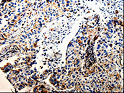 The image on the left is immunohistochemistry of paraffin-embedded Human lung cancer tissue using CSB-PA577887(CTSZ Antibody) at dilution 1/25, on the right is treated with fusion protein. (Original magnification: ×200)
