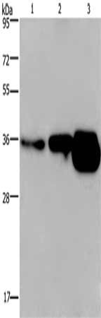 Gel: 8%SDS-PAGE, Lysate: 40 μg, Lane 1-3: Human breast infiltrative duct tissue, Human fetal brain tissue, mouse brain tissue, Primary antibody: CSB-PA283839(CUEDC2 Antibody) at dilution 1/600, Secondary antibody: Goat anti rabbit IgG at 1/8000 dilution, Exposure time: 2 minutes