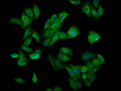 Immunofluorescence staining of HepG2 cells with CSB-PA617942LA01HU at 1:200, counter-stained with DAPI. The cells were fixed in 4% formaldehyde, permeabilized using 0.2% Triton X-100 and blocked in 10% normal Goat Serum. The cells were then incubated with the antibody overnight at 4°C. The secondary antibody was Alexa Fluor 488-congugated AffiniPure Goat Anti-Rabbit IgG(H+L).