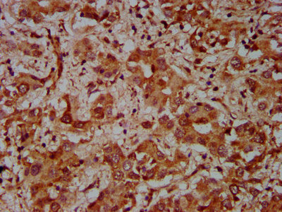 IHC image of CSB-PA617942LA01HU diluted at 1:600 and staining in paraffin-embedded human liver cancer performed on a Leica BondTM system. After dewaxing and hydration, antigen retrieval was mediated by high pressure in a citrate buffer (pH 6.0). Section was blocked with 10% normal goat serum 30min at RT. Then primary antibody (1% BSA) was incubated at 4°C overnight. The primary is detected by a biotinylated secondary antibody and visualized using an HRP conjugated SP system.