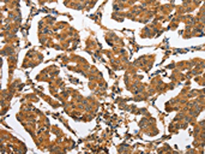 The image on the left is immunohistochemistry of paraffin-embedded Human breast cancer tissue using CSB-PA568771(CXCL14 Antibody) at dilution 1/60, on the right is treated with fusion protein. (Original magnification: ×200)