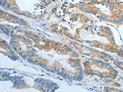 The image on the left is immunohistochemistry of paraffin-embedded Human colon cancer tissue using CSB-PA989223(CXCR3 Antibody) at dilution 1/20, on the right is treated with fusion protein. (Original magnification: ×200)