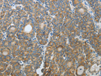 The image on the left is immunohistochemistry of paraffin-embedded Human thyroid cancer tissue using CSB-PA989223(CXCR3 Antibody) at dilution 1/20, on the right is treated with fusion protein. (Original magnification: ×200)