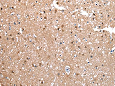 The image on the left is immunohistochemistry of paraffin-embedded Human brain tissue using CSB-PA250029(CXCR4 Antibody) at dilution 1/20, on the right is treated with synthetic peptide. (Original magnification: ×200)