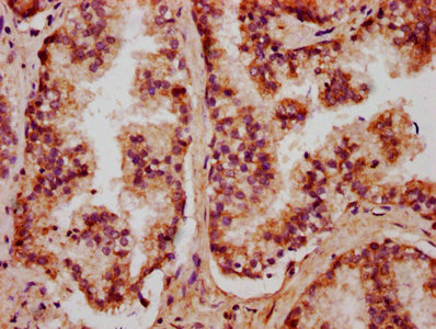 IHC image of CSB-PA887998LA01HU diluted at 1:400 and staining in paraffin-embedded human prostate cancer performed on a Leica BondTM system. After dewaxing and hydration, antigen retrieval was mediated by high pressure in a citrate buffer (pH 6.0). Section was blocked with 10% normal goat serum 30min at RT. Then primary antibody (1% BSA) was incubated at 4°C overnight. The primary is detected by a biotinylated secondary antibody and visualized using an HRP conjugated SP system.
