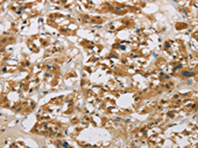 The image on the left is immunohistochemistry of paraffin-embedded Human thyroid cancer tissue using CSB-PA591028(CYP11B1 Antibody) at dilution 1/25, on the right is treated with fusion protein. (Original magnification: ×200)