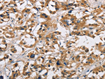 The image on the left is immunohistochemistry of paraffin-embedded Human thyroid cancer tissue using CSB-PA263571(CYP21A2 Antibody) at dilution 1/60, on the right is treated with fusion protein. (Original magnification: ×200)