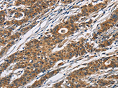 The image on the left is immunohistochemistry of paraffin-embedded Human gastic cancer tissue using CSB-PA263571(CYP21A2 Antibody) at dilution 1/60, on the right is treated with fusion protein. (Original magnification: ×200)