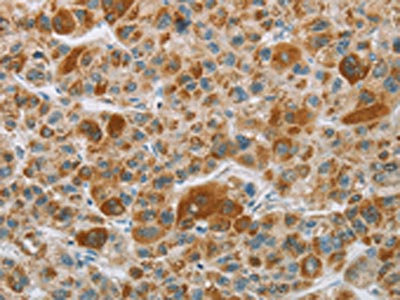 The image on the left is immunohistochemistry of paraffin-embedded Human liver cancer tissue using CSB-PA446866(CYP27A1 Antibody) at dilution 1/50, on the right is treated with fusion protein. (Original magnification: ×200)