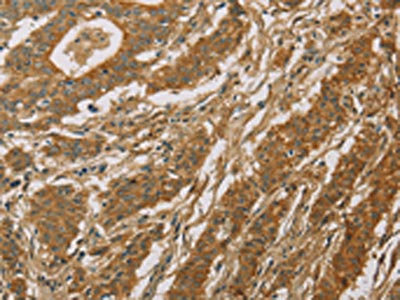 The image on the left is immunohistochemistry of paraffin-embedded Human gastic cancer tissue using CSB-PA956260(CYP39A1 Antibody) at dilution 1/50, on the right is treated with fusion protein. (Original magnification: ×200)