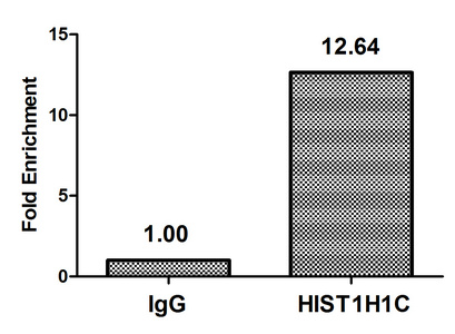 Chromatin Immunoprecipitation Hela (4*106, treated with 30mM sodium crotonylate for 4h) were treated with Micrococcal Nuclease, sonicated, and immunoprecipitated with 8µg anti-HIST1H1C (CSB-PA010378PA158crHU) or a control normal rabbit IgG. The resulting ChIP DNA was quantified using real-time PCR with primers against the β-Globin promoter.