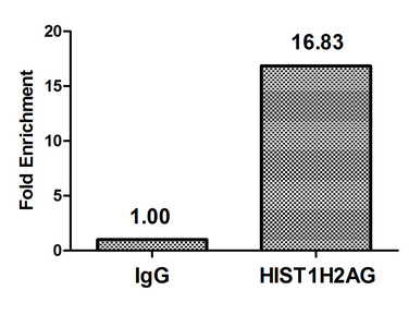 Chromatin Immunoprecipitation Hela (4*106, treated with 30mM sodium crotonylate for 4h) were treated with Micrococcal Nuclease, sonicated, and immunoprecipitated with 5μg anti-HIST1H2AG (CSB-PA010389PA118crHU) or a control normal rabbit IgG. The resulting ChIP DNA was quantified using real-time PCR with primers against the β-Globin promoter.