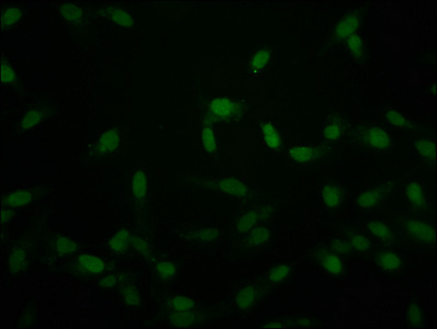Immunofluorescence staining of Hela cells with CSB-PA010389PA118crHU at 1:50, counter-stained with DAPI. The cells were fixed in 4% formaldehyde, permeabilized using 0.2% Triton X-100 and blocked in 10% normal Goat Serum. The cells were then incubated with the antibody overnight at 4°C. The secondary antibody was Alexa Fluor 488-congugated AffiniPure Goat Anti-Rabbit IgG(H+L).