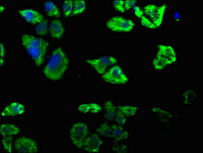 Immunofluorescence staining of Hela cells with CSB-PA730138OA01HU at 1:50, counter-stained with DAPI. The cells were fixed in 4% formaldehyde, permeabilized using 0.2% Triton X-100 and blocked in 10% normal Goat Serum. The cells were then incubated with the antibody overnight at 4°C. The secondary antibody was Alexa Fluor 488-congugated AffiniPure Goat Anti-Rabbit IgG(H+L).