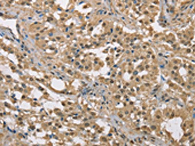 The image on the left is immunohistochemistry of paraffin-embedded Human liver cancer tissue using CSB-PA111089(DACH2 Antibody) at dilution 1/40, on the right is treated with fusion protein. (Original magnification: ×200)