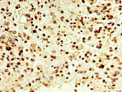 IHC image of CSB-PA006494LA01HU diluted at 1:500 and staining in paraffin-embedded human glioma cancer performed on a Leica BondTM system. After dewaxing and hydration, antigen retrieval was mediated by high pressure in a citrate buffer (pH 6.0). Section was blocked with 10% normal goat serum 30min at RT. Then primary antibody (1% BSA) was incubated at 4°C overnight. The primary is detected by a biotinylated secondary antibody and visualized using an HRP conjugated SP system.
